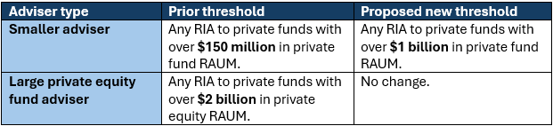 Most notably, the proposed amendments would raise the thresholds required to file Form PF, the confidential reporting form required for certain SEC-registered investment advisers (RIAs) to private funds. If adopted, the amendments would eliminate filing requirements for smaller filers (RIAs with at least $150 million in private fund regulatory assets under management[1]) by raising the filing threshold from $150 million to $1 billion. In addition, the amendments would raise the exposure reporting threshold for large hedge fund advisers from $1.5 billion in hedge fund assets to $10 billion. Notably, the amendments do not change the current $2 billion threshold for large private equity fund advisers.