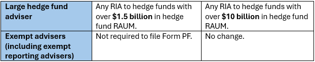 If adopted, the SEC estimates that the number of RIAs to private funds subject to Form PF filings would decrease from 70% to 40% (nearly 50% fewer reporting advisers) while the percentage of private fund gross assets reported by such RIAs subject to Form PF would decrease from 96% to just 94%. Similarly, the SEC estimates that the number of RIAs subject to filing Form PF as a large hedge fund adviser would fall from 26% of all private fund RIAs to just 9% (nearly two-thirds fewer large hedge fund advisers).